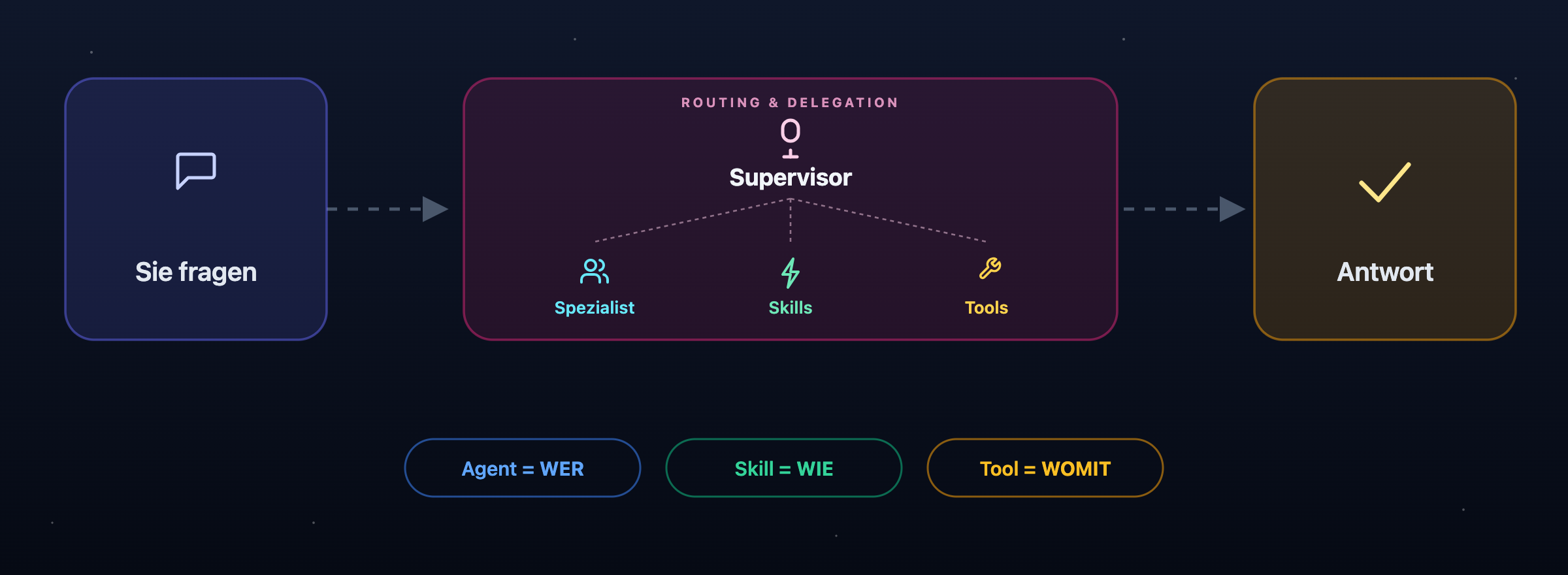 Im Mittelpunkt steht ein Supervisor-Agent. Er ist die zentrale Instanz, mit der du sprichst. Der Supervisor versteht dein Anliegen, zerlegt es in Teilschritte und schickt dann spezialisierte Agenten los, die sich jeweils um einen Teil der Aufgabe kümmern.