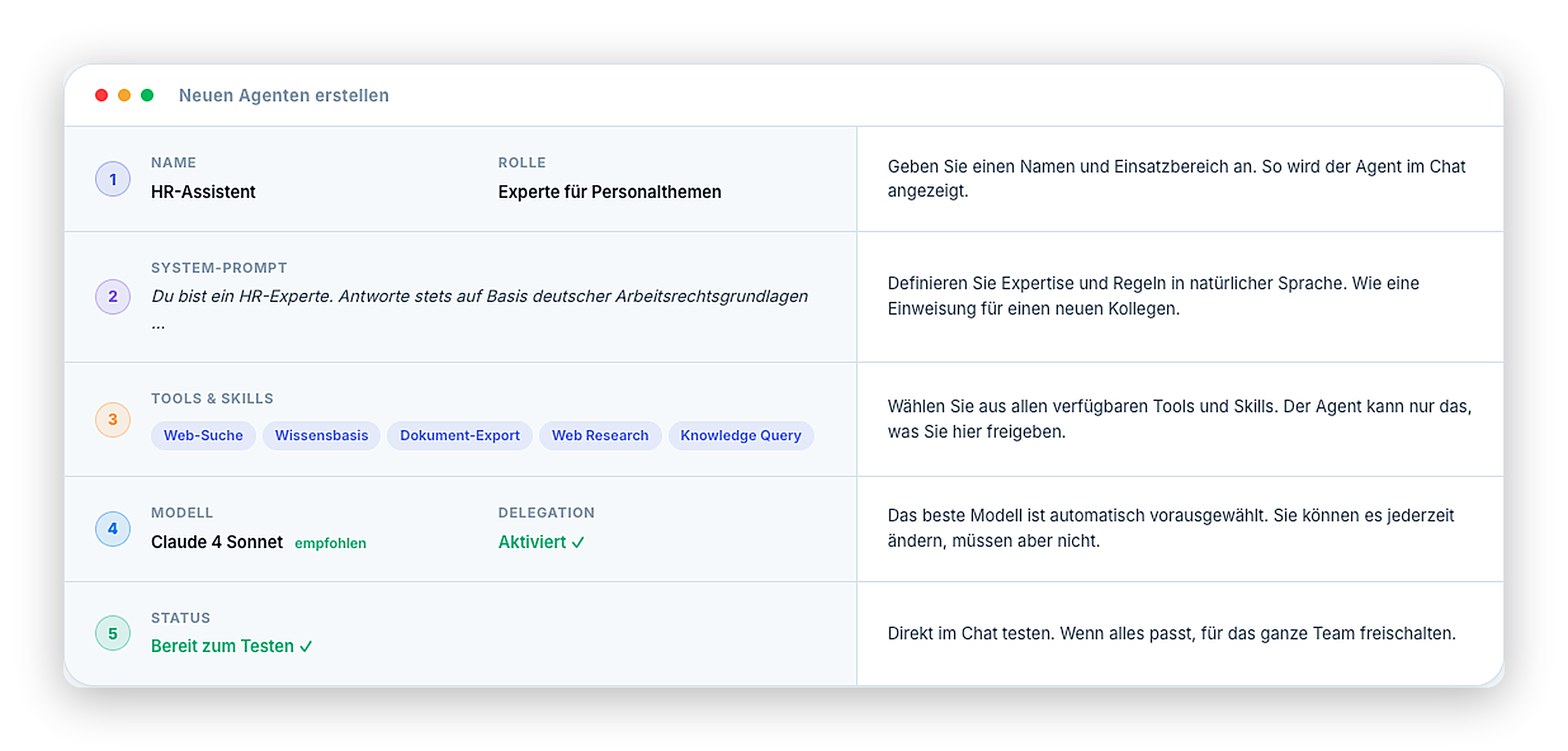 Die Agenten sind Teil der nächsten Entwicklungsstufe, an der wir aktuell arbeiten. Bis zum Sommer 2026 werden sie in der nächsten Version des KI-Workplace verfügbar sein. Du findest weitere geplante Feature in unserem Ausblick.
