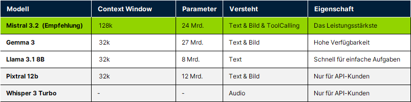 Mistral 3.2 ist als Standard im Chat und in der Assistenten-Erstellung vorausgewählt, da es zurzeit für die meisten Aufgaben die besten Ergebnisse erzielt.