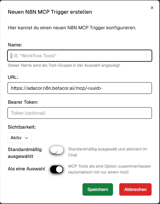 - Als eine Auswahl: Ein n8n-Workflow kann mehrere Tools bereitstellen. Mit dieser Option erscheinen alle Tools des Workflows als ein gemeinsamer Eintrag im Tool-Menü. User können dann nur den gesamten Workflow an- oder ausschalten, nicht einzelne Tools daraus.