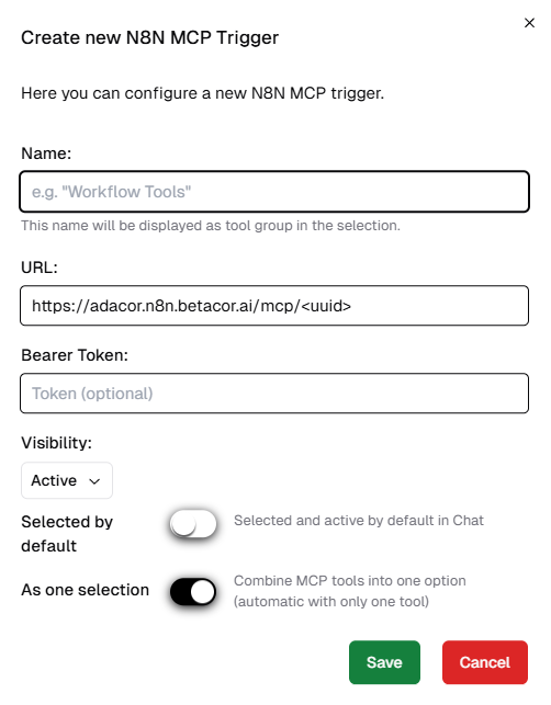 - As one selection: An n8n workflow can provide multiple tools. With this option, all tools in the workflow appear as a single entry in the tool menu. Users can then only enable or disable the entire workflow, not individual tools within it.